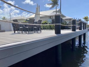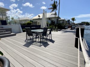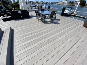 Trade Builders Supplies was engaged to help with this very glamorous deck rejuvenation project in Pelican Waters. Excessive sun, wind & salt spray had all started to take their toll on the existing 140mm x 25mm hardwood decking. The design brief was simple: Keep the existing deck sub-frame and replace the timber decking with a great looking product that can withstand the harsh elements. Azek Vintage Coastal was the composite decking of choice. Not only is it highly resistant to decay & fading with a 50 year warranty, it also has three huge advantages over most other composite decking products:- P5 Slip Rating (level of grip) – The highest slip rating possible